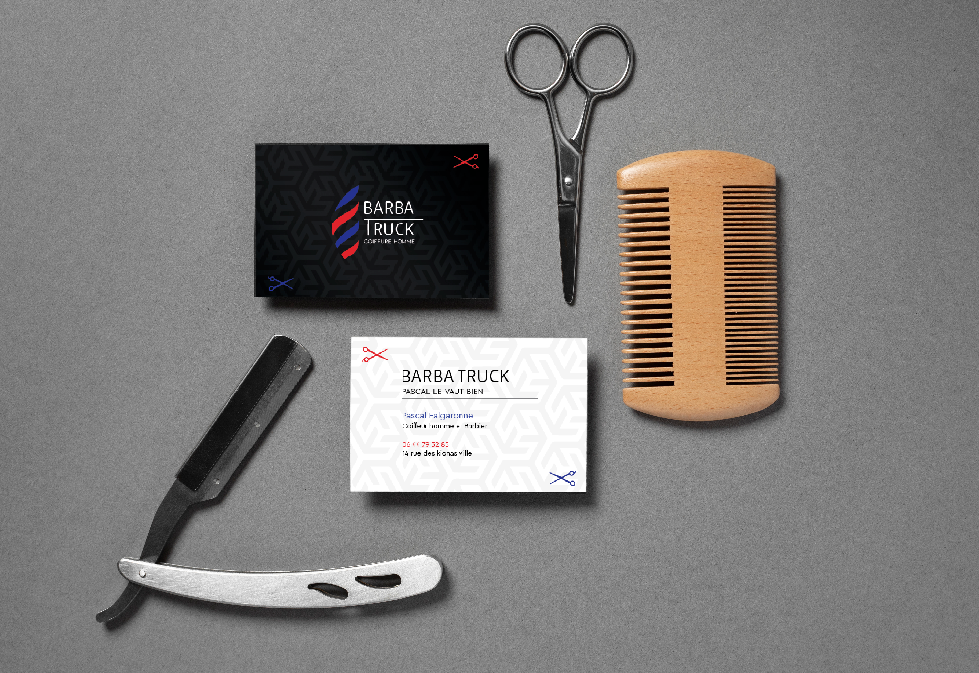 LE PROJET Logo réalisé pour l'entreprise de coiffure pour homme BARBA TRUCK. Utilisation des logiciels Illustrator et Photoshop. BARBA TRUCK est un salon de coiffure pour homme mobile.
